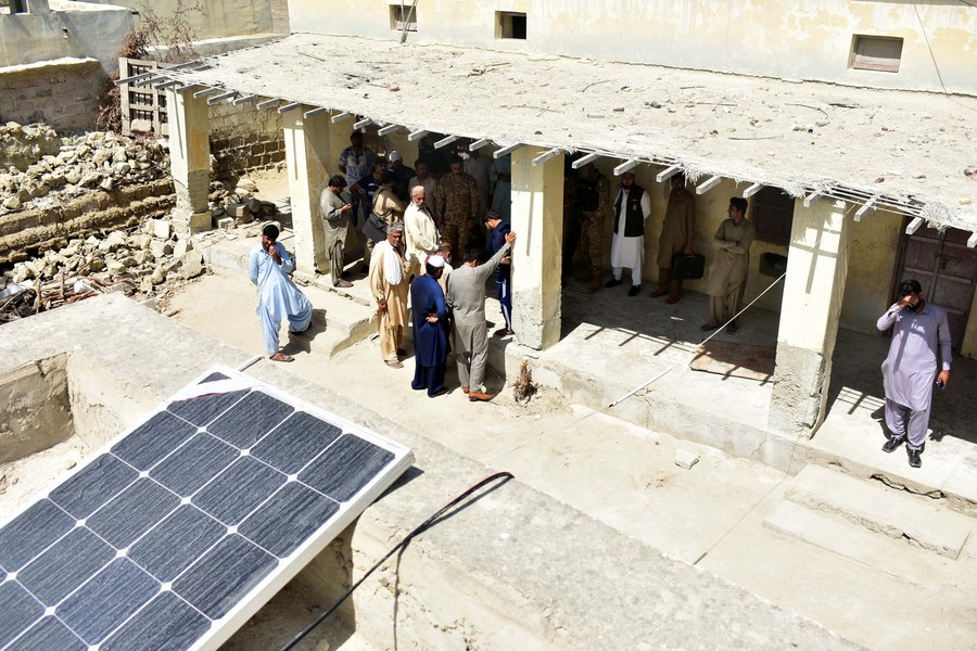 Locals gather at a house with a China-donated solar panel installed in Gwadar, Pakistan, March 14, 2022. (Str/Xinhua)