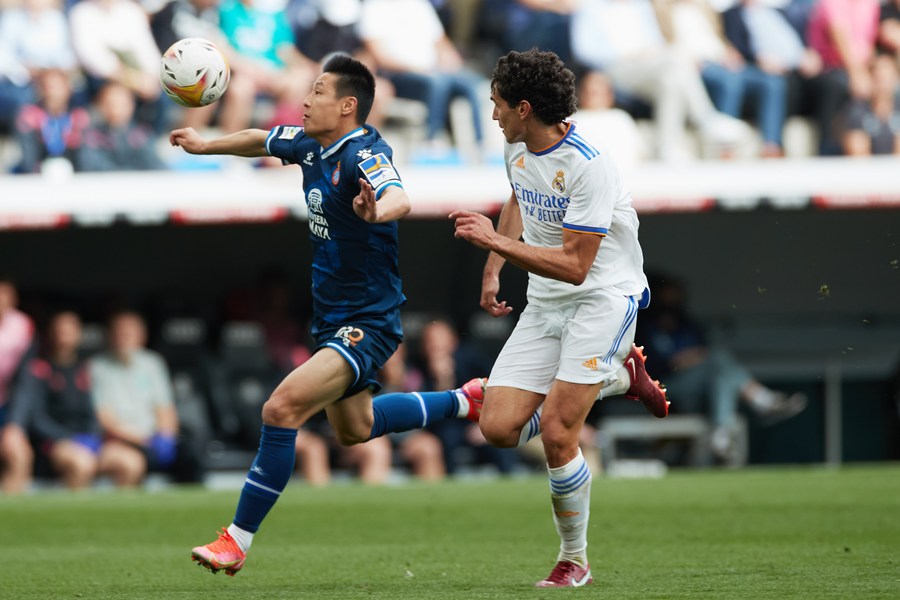 Real Madrid's Jesus Vallejo (R) vies with Espanyol's Wu Lei during a Spanish La Liga football match in Madrid, Spain, on April 30, 2022. (Xinhua/Meng Dingbo)