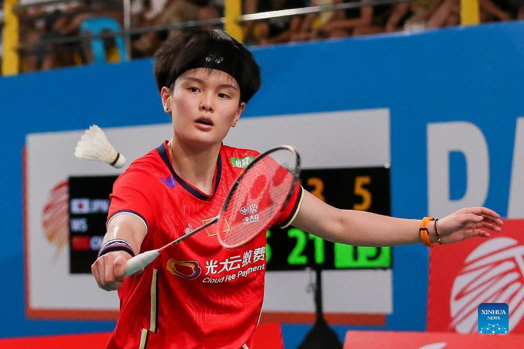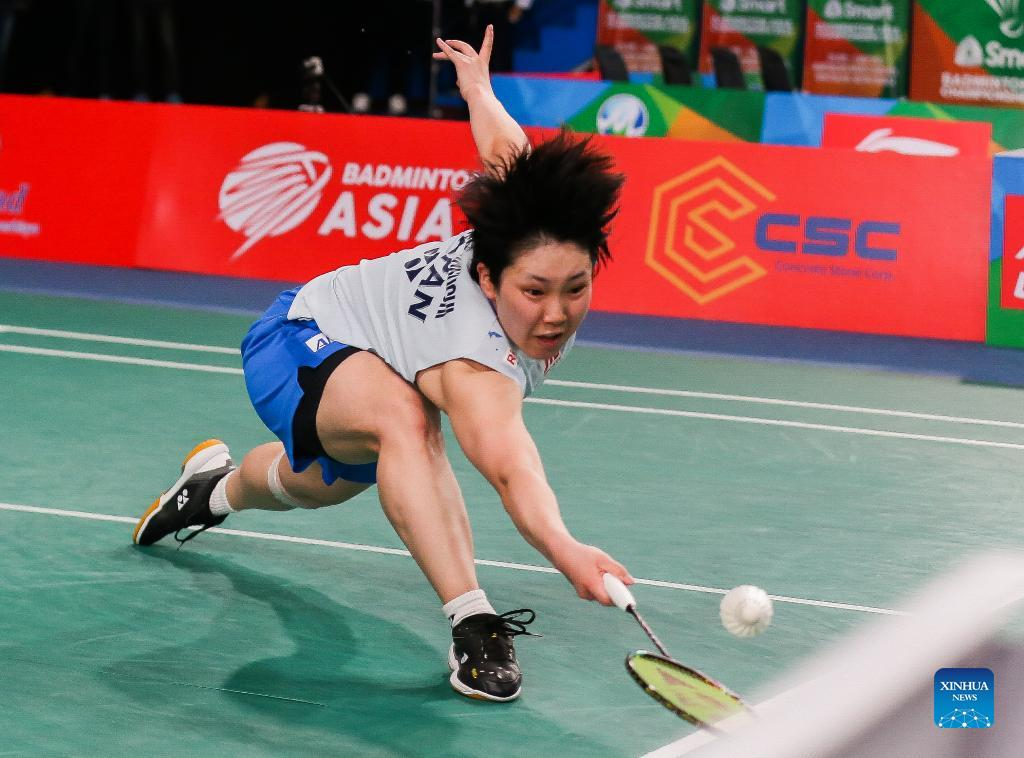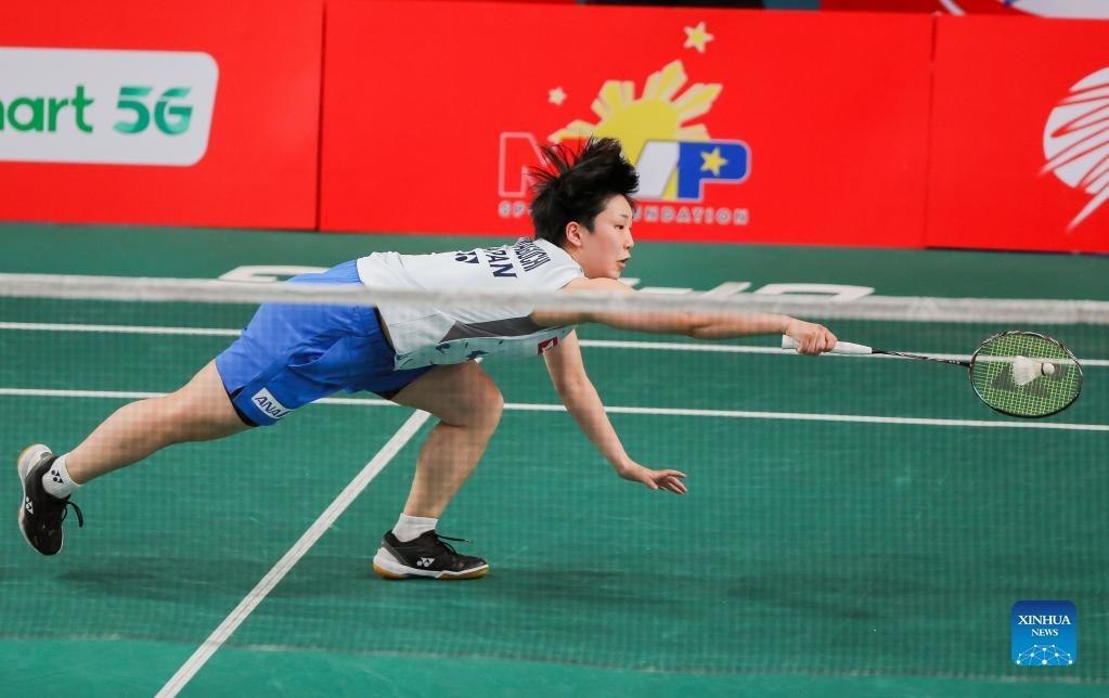 Wang Zhiyi of China hits a return during the women's singles final against Yamaguchi Akane of Japan at the Badminton Asia Championships 2022 in Manila, the Philippines, April 30, 2022. (Xinhua/Rouelle Umali)