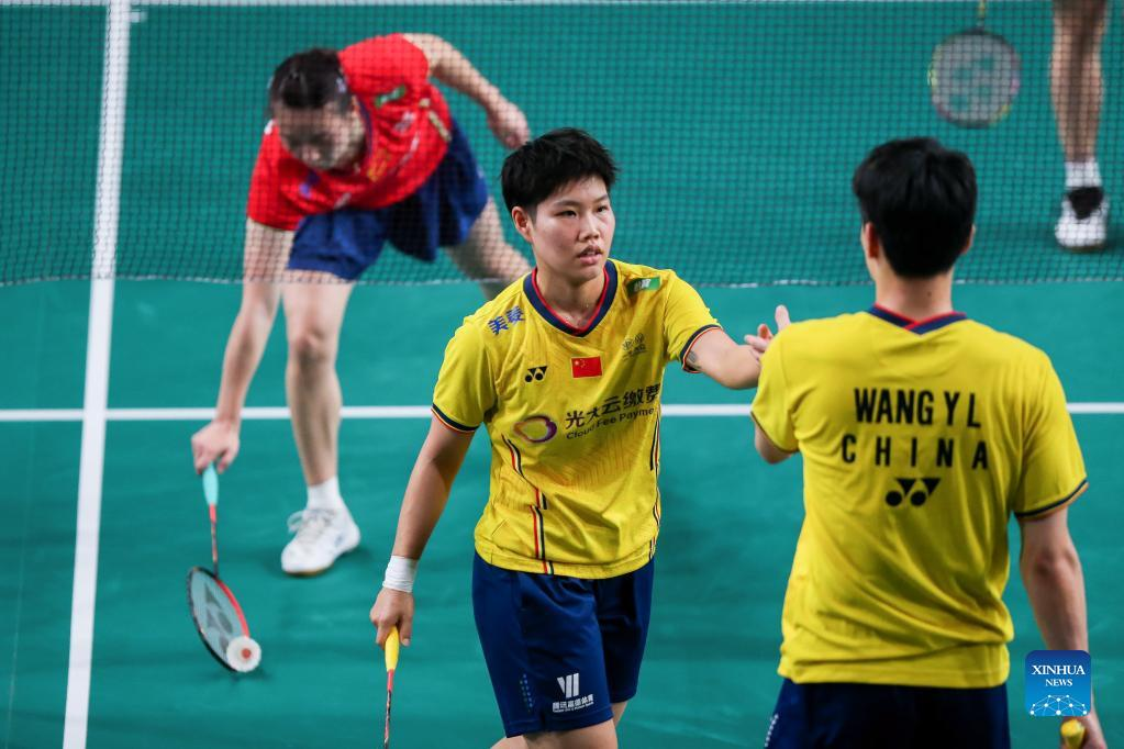 Wang Yilyu/Huang Dongping (2nd R) of China greet each other during the mixed doubles final against their compatriots Zheng Siwei/Huang Yaqiong at the Badminton Asia Championships 2022 in Manila, the Philippines, May 1, 2022. (Xinhua/Rouelle Umali)