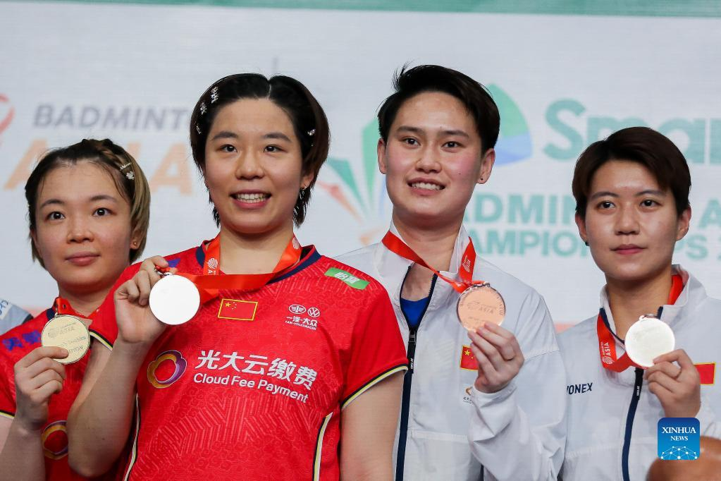 Chen Qingchen (1st L)/Jia Yifan (2nd L) and Du Yue (2nd R)/Li Wen of China react during the awarding ceremony for the women's doubles at the Badminton Asia Championships 2022 in Manila, the Philippines, May 1, 2022. (Xinhua/Rouelle Umali)