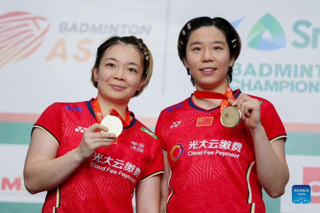 Chen Qingchen (L)/Jia Yifan of China react during the awarding ceremony for the women's doubles at the Badminton Asia Championships 2022 in Manila, the Philippines, May 1, 2022. (Xinhua/Rouelle Umali)
