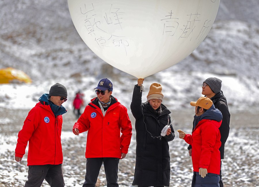 Scientific research members prepare to launch a balloon carrying radiosonde at the Mount Qomolangma base camp on April 30, 2022. (Xinhua/Jiang Fan)