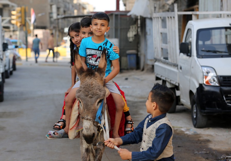 Children ride a donkey at a Baghdad neighborhood to celebrate the Eid al-Fitr holiday on May 2, 2022. (Xinhua / Khalil Dawood)■
