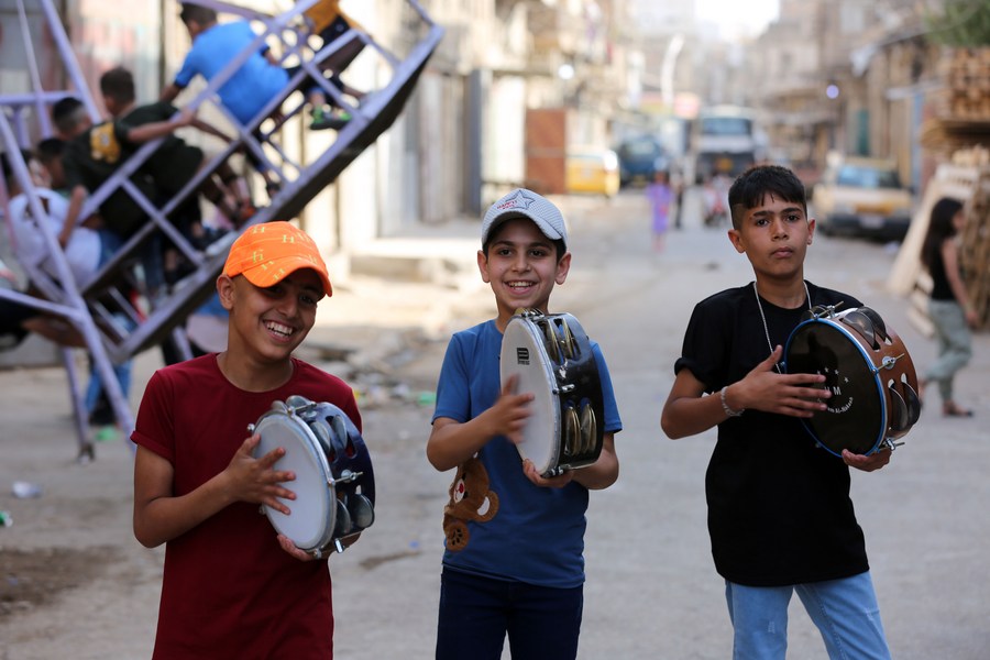 Children beat tambourines in a Baghdad neighborhood to celebrate the Eid al-Fitr holiday on May 2, 2022. (Xinhua / Khalil Dawood)