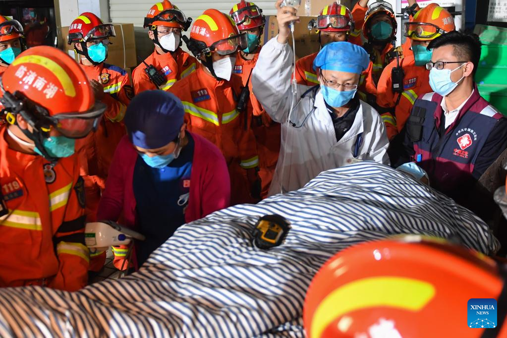 Rescuers transfer the ninth survivor who has been pulled from the rubble 88 hours after a self-built residential building collapsed in Changsha, central China's Hunan Province, May 3, 2022. A self-constructed residential building collapsed on April 29 in Wangcheng District in Changsha. (Xinhua/Chen Zeguo)