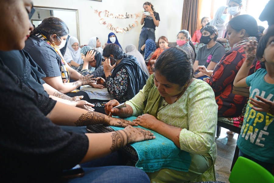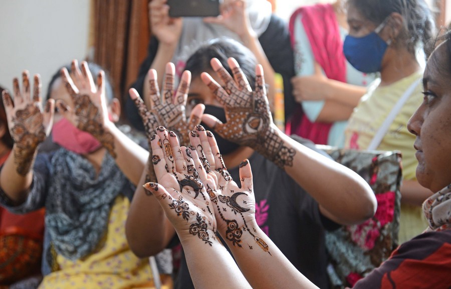 Indian Muslim women get their hands decorated with traditional henna designs on the eve of Eid al-Fitr in Bangalore, India, May 2, 2022. (Str/Xinhua)