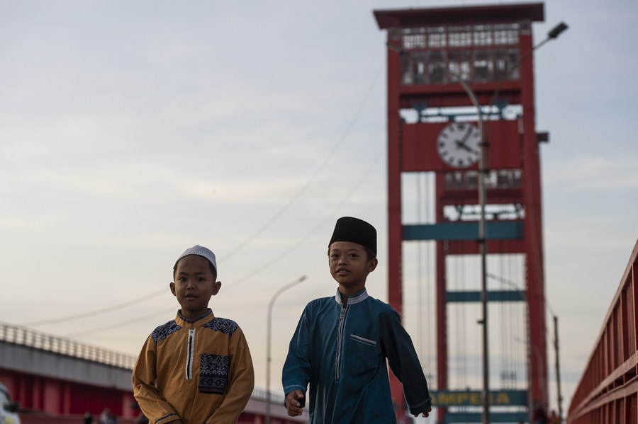 Children cross the Ampera bridge to attend Eid al-Fitr prayers in Palembang of South Sumatra, Indonesia, May 2, 2022. (Xinhua/Veri Sanovri)