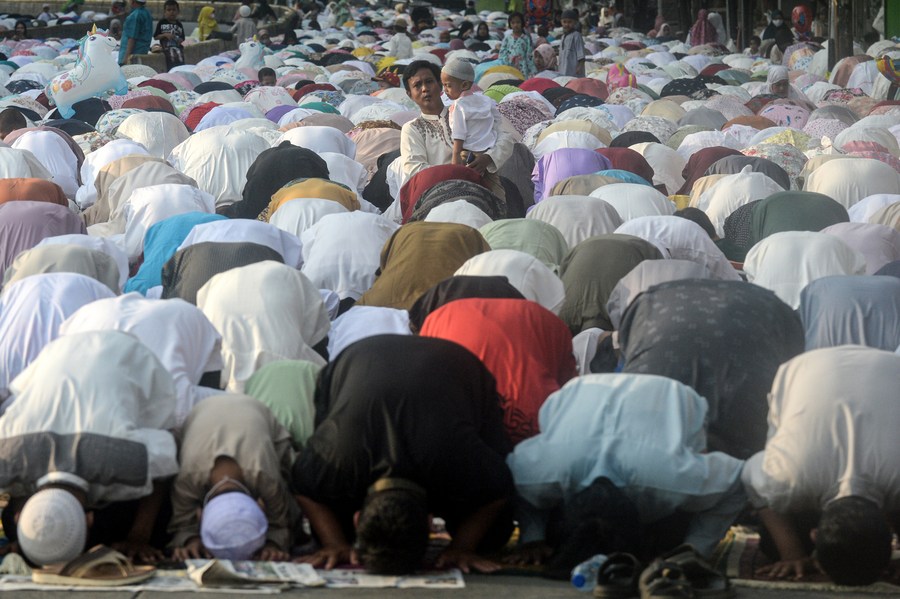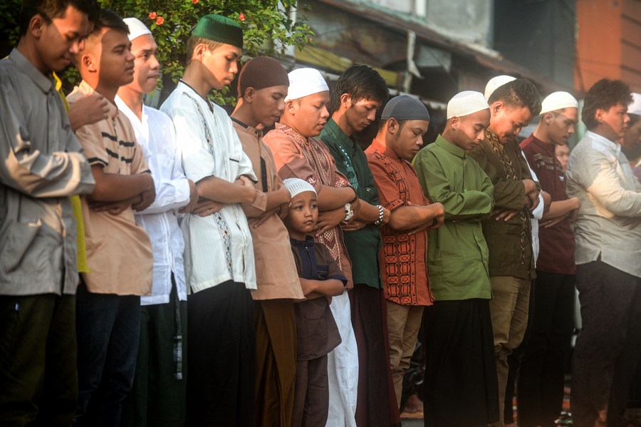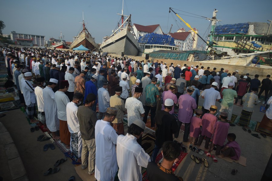 People attend morning prayers during Eid al-Fitr celebrations at Sunda Kelapa Port in Jakarta, Indonesia, May 2, 2022. (Xinhua/Zulkarnain)