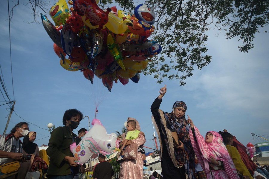 Children buy balloons during Eid al-Fitr celebrations at Sunda Kelapa Port in Jakarta, Indonesia, May 2, 2022. (Xinhua/Zulkarnain)