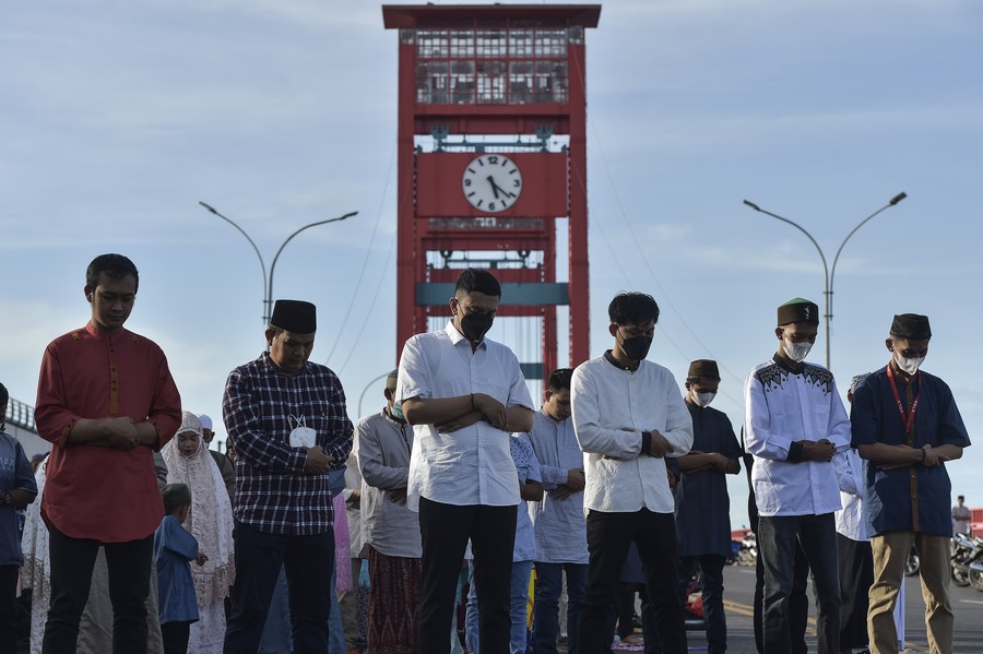 People attend Eid al-Fitr prayers at the Ampera Bridge in Palembang of South Sumatra in Indonesia, May 2, 2022. (Xinhua/Veri Sanovri)