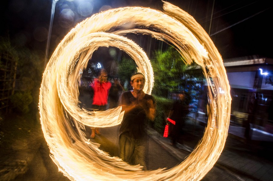 People play with fire during a torch parade in celebrating the Eid al-Fitr festival in Yogyakarta, Indonesia, May 1, 2022. (Photo by Agung Supriyanto/Xinhua)