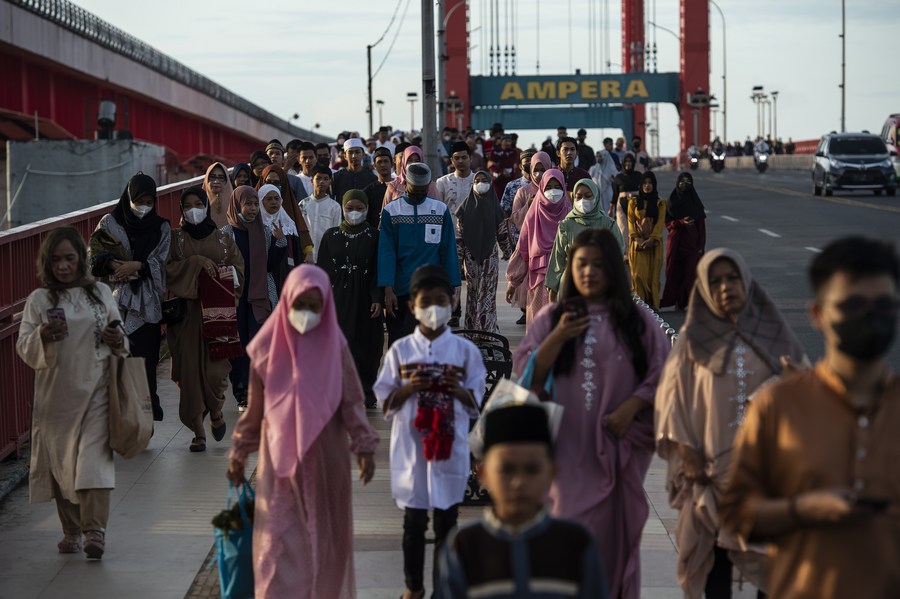 People cross the Ampera bridge to attend Eid al-Fitr prayers in Palembang of South Sumatra, Indonesia, May 2, 2022. (Xinhua/Veri Sanovri)■
