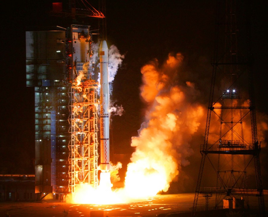 A carrier rocket carrying a satellite of the BeiDou Navigation Satellite System (BDS) blasts off from the Xichang Satellite Launch Center in southwest China's Sichuan Province, April 14, 2007. (Xinhua/Li Gang)
