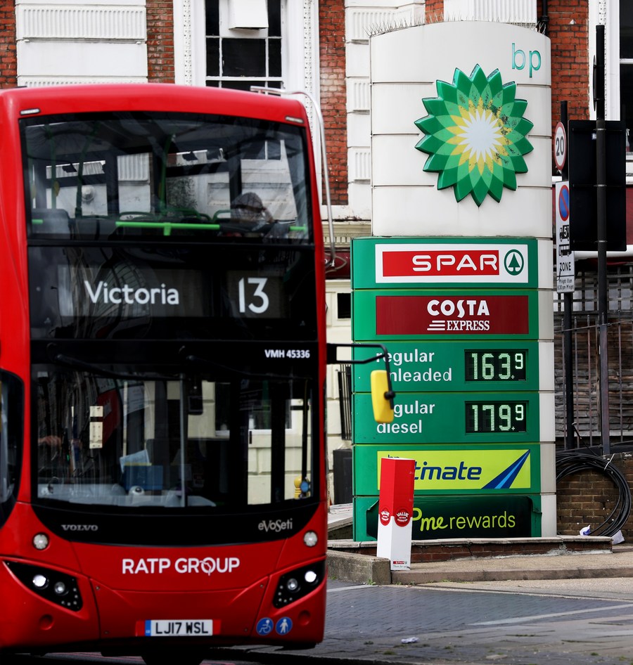 A bus runs past a petrol station in London, Britain, April 8, 2022. (Xinhua/Li Ying)