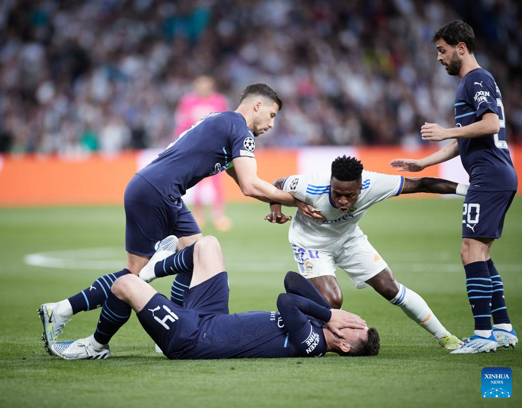 Real Madrid's Vinicius Junior (2nd R) conflicts with Manchester City's Aymeric Laporte (bottom) during the UEFA Champions League semifinal second leg football match between Real Madrid of Spain and Manchester City of England in Madrid, Spain, May 4, 2022. (Xinhua/Meng Dingbo)