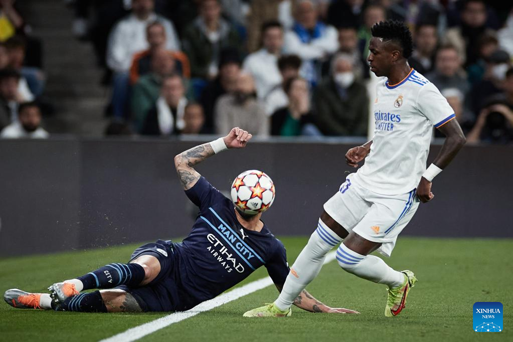 Real Madrid's Vinicius Junior (R) vies with Manchester City's Kyle Walker during the UEFA Champions League semifinal second leg football match between Real Madrid of Spain and Manchester City of England in Madrid, Spain, May 4, 2022. (Xinhua/Meng Dingbo)