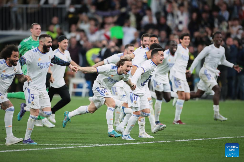 Real Madrid's players celebrate the victory after the UEFA Champions League semifinal second leg football match between Real Madrid of Spain and Manchester City of England in Madrid, Spain, May 4, 2022. (Xinhua/Meng Dingbo)