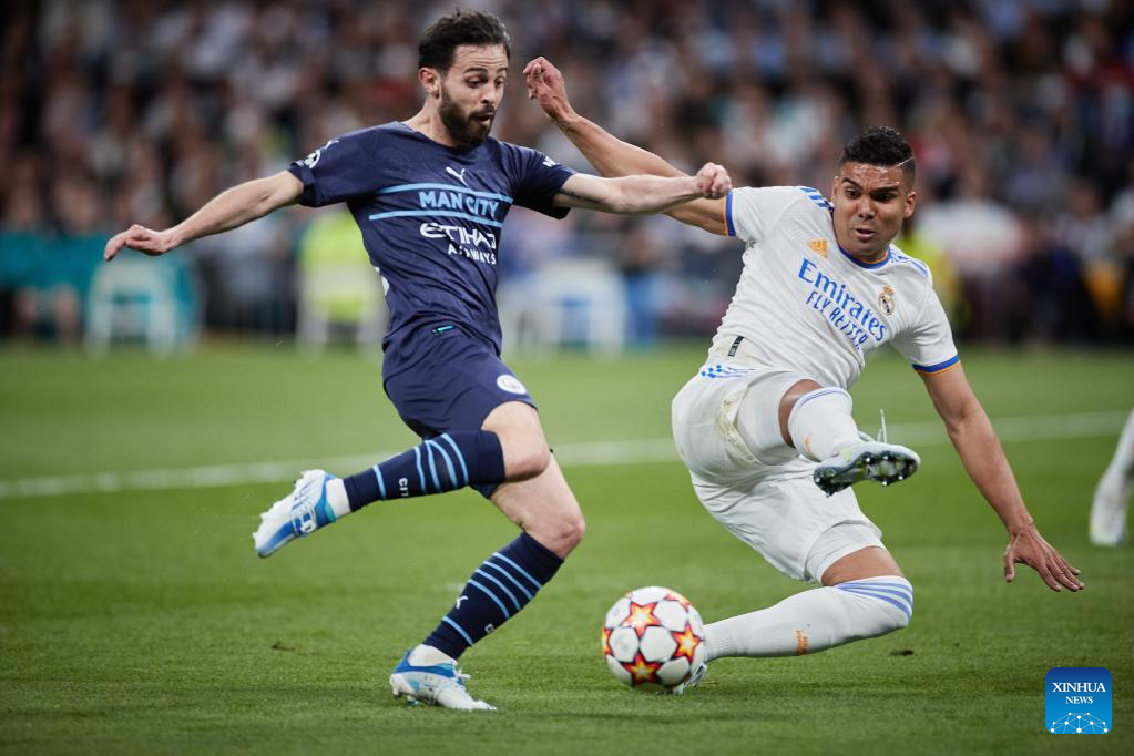 Real Madrid's Casemiro (R) vies with Manchester City's Bernardo Silva during the UEFA Champions League semifinal second leg football match between Real Madrid of Spain and Manchester City of England in Madrid, Spain, May 4, 2022. (Xinhua/Meng Dingbo)