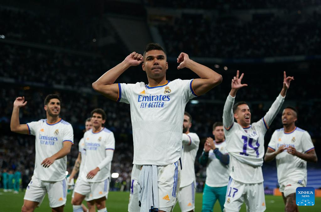 Real Madrid's Casemiro (C) celebrates the victory after the UEFA Champions League semifinal second leg football match between Real Madrid of Spain and Manchester City of England in Madrid, Spain, May 4, 2022. (Photo by Pablo Morano/Xinhua)