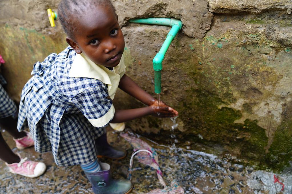 A child washes her hands before a meal at a school in Mathare slums area, Nairobi, Kenya, April 28, 2022. (Xinhua/Dong Jianghui)