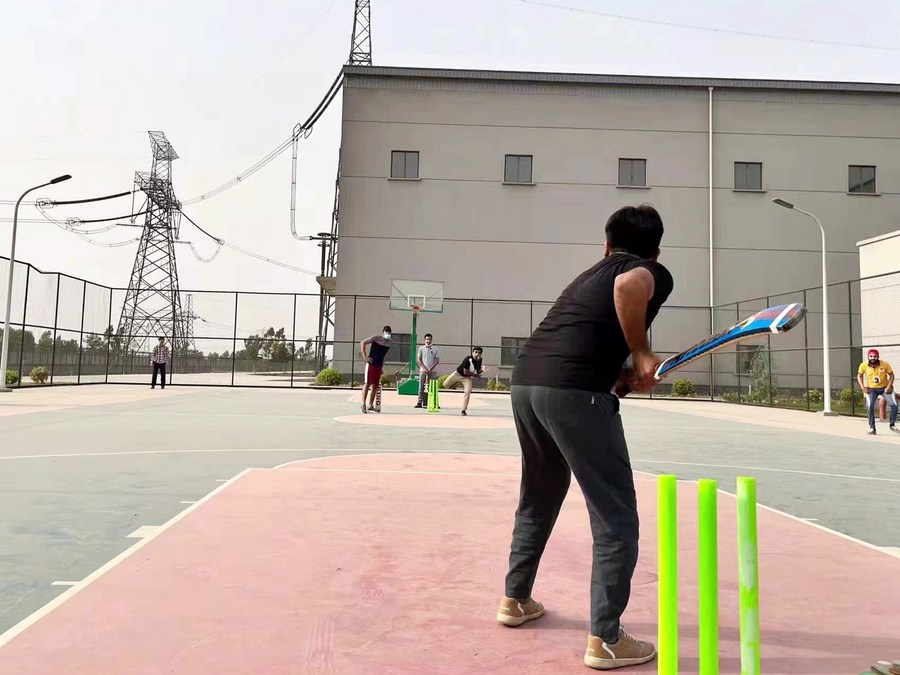 Chinese and Pakistani employees of China-Pakistan Economic Corridor (CPEC)'s Matiari-Lahore transmission line project play cricket during Eid al-Fitr in Lahore, Pakistan, on May 3, 2022. (Str/Xinhua)