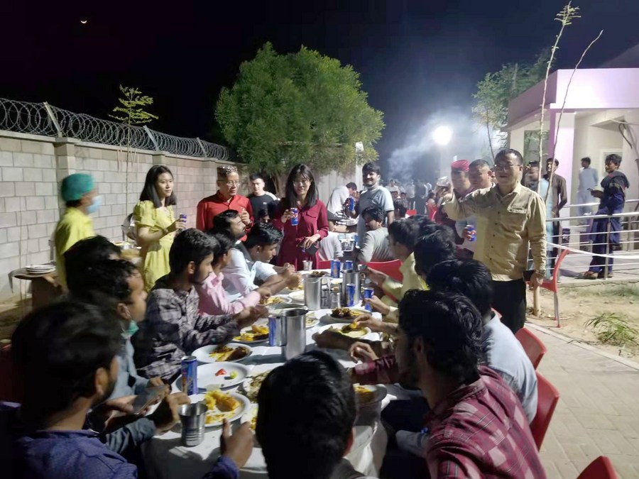 Chinese workers working for the China-Pakistan Economic Corridor (CPEC) Thar Coal Power Project host a dinner for their Pakistani colleagues on the occasion of Eid al-Fitr in Tharparkar district of the southern Sindh province on May 3, 2022. (Str/Xinhua)