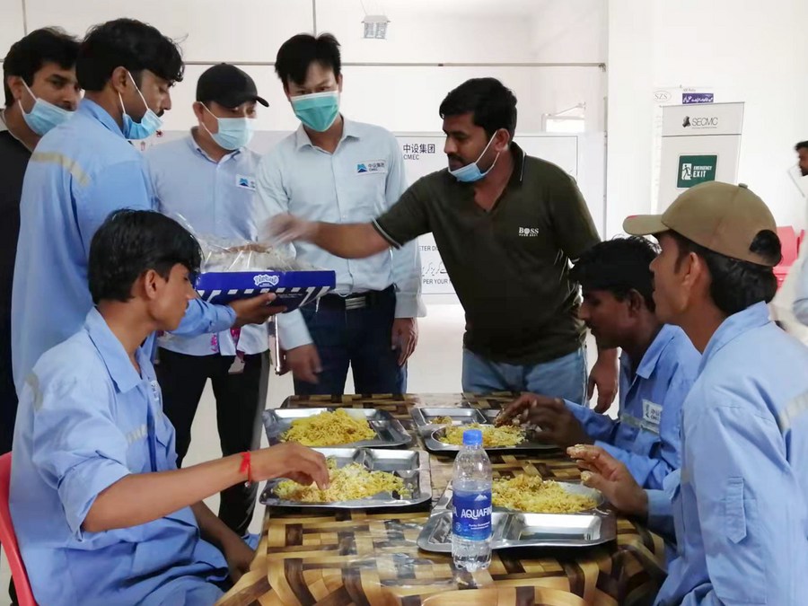 Chinese employees serve lunch to their Pakistani colleagues at China-Pakistan Economic Corridor (CPEC)'s Engro Thar Coal Power Project during Eid al-Fitr in Tharparkar district of the southern Sindh province, Pakistan, on May 3, 2022. (Str/Xinhua)