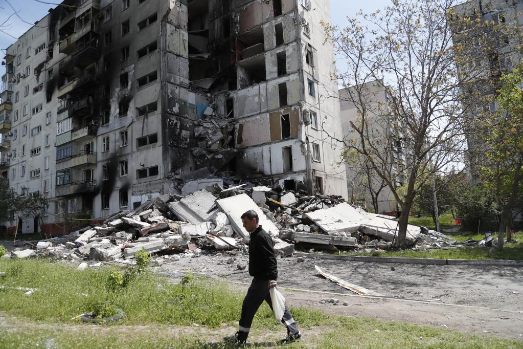 Photo taken on May 3, 2022 shows a damaged building in the port city of Mariupol. (Photo by Victor/Xinhua)