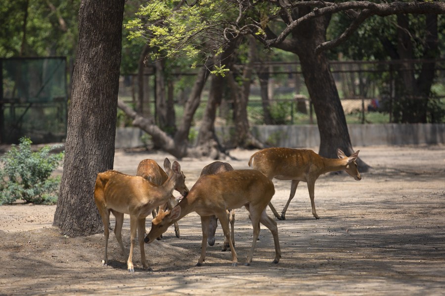 A herd of deer rest under trees on a hot summer day at the National Zoological Park in New Delhi, May 7, 2022. (Xinhua/Javed Dar)
