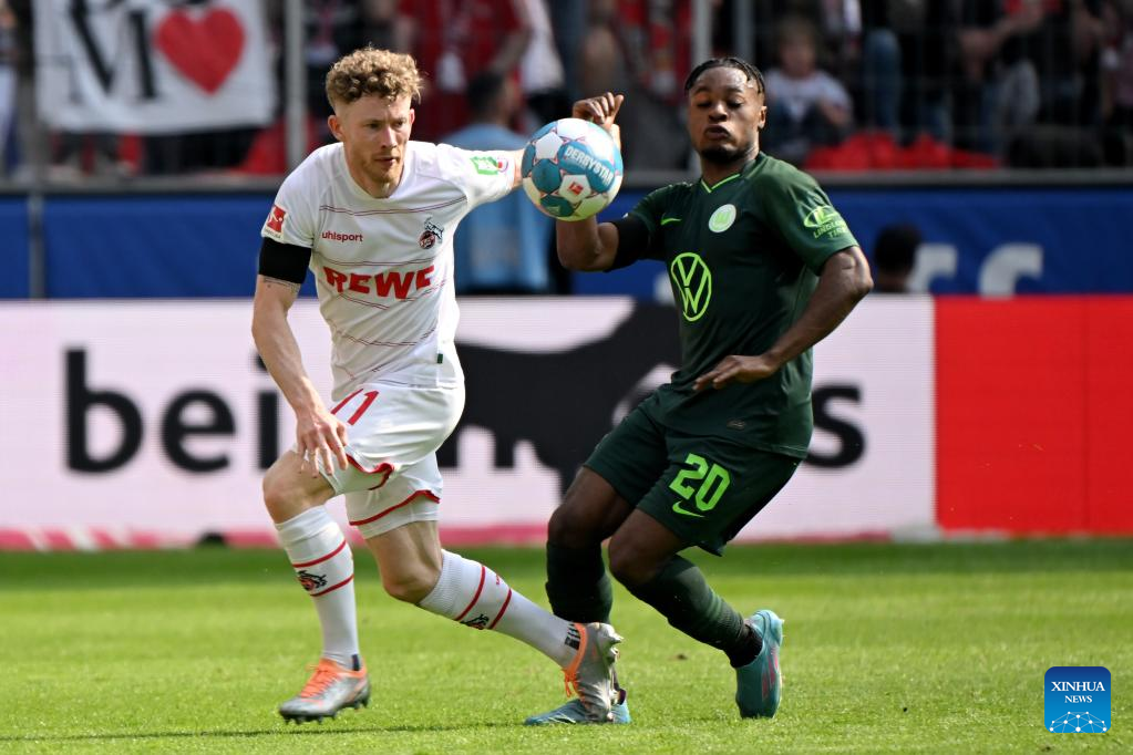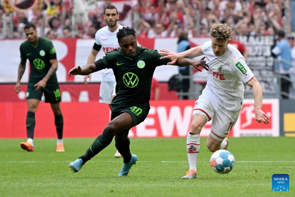 Lukas Nmecha (R) of Wolfsburg vies with Mark Uth of Cologne during the German first division Bundesliga football match between FC Cologne and VfL Wolfsburg in Cologne, Germany, May 7, 2022. (Photo by Ulrich Hufnagel/Xinhua)