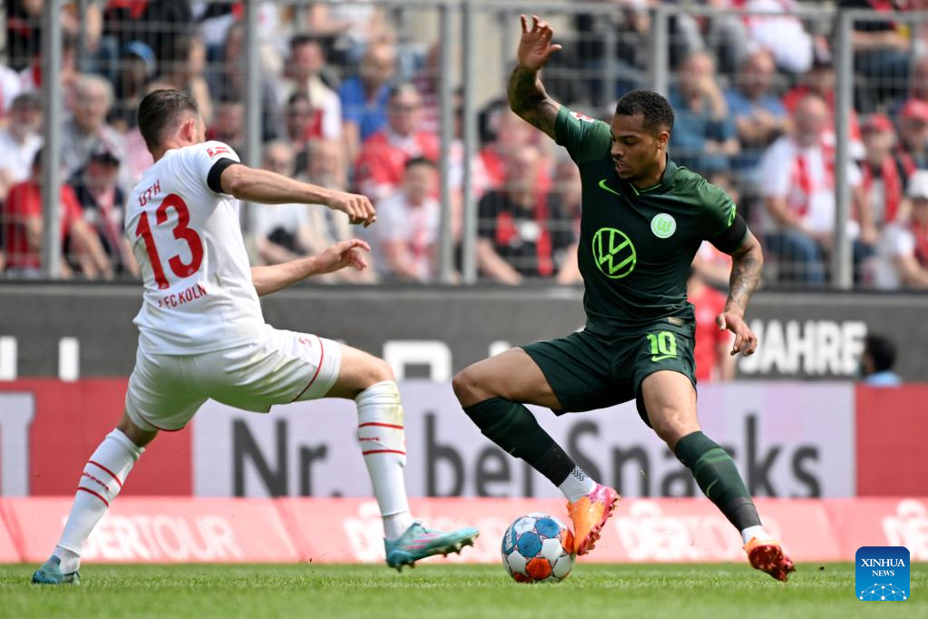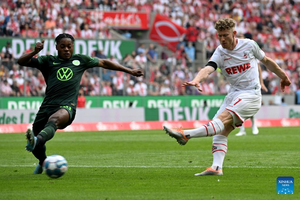 Florian Kainz (R) of Cologne shoots during the German first division Bundesliga football match between FC Cologne and VfL Wolfsburg in Cologne, Germany, May 7, 2022. (Photo by Ulrich Hufnagel/Xinhua)