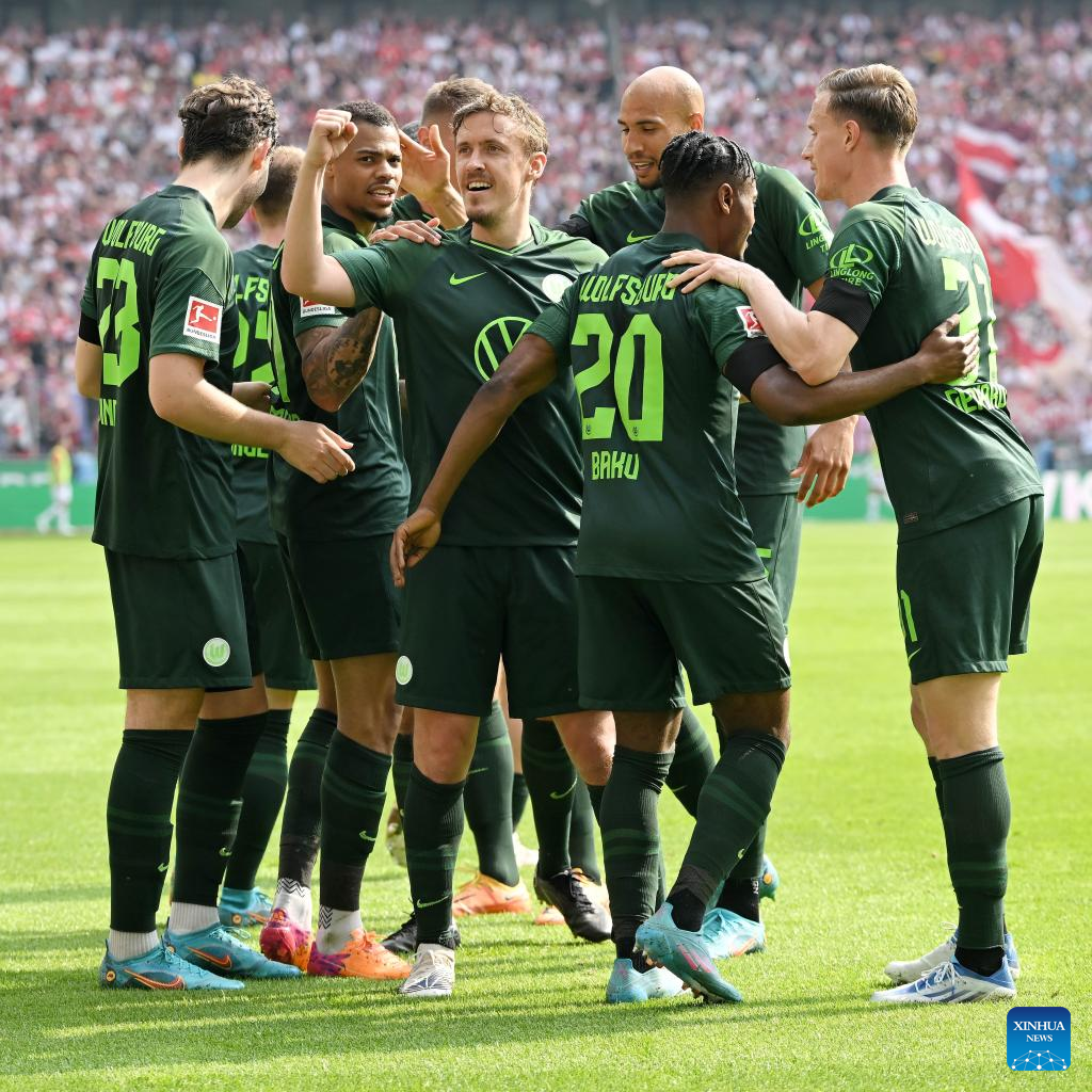 Players of Wolfsburg celebrate scoring during the German first division Bundesliga football match between FC Cologne and VfL Wolfsburg in Cologne, Germany, May 7, 2022. (Photo by Ulrich Hufnagel/Xinhua)