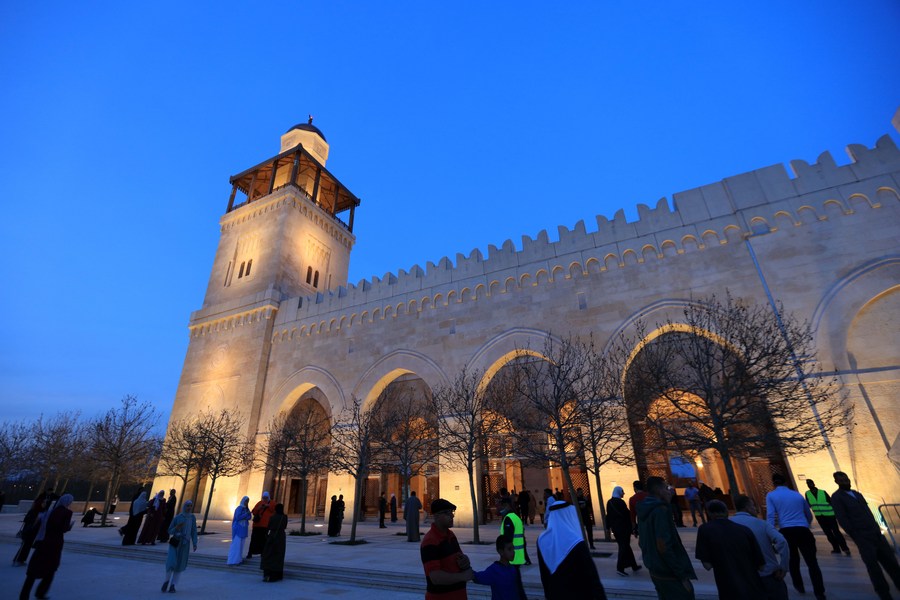 People gather at the King Hussein Bin Talal Mosque in Amman, Jordan, on April 1, 2022. (Photo by Mohammad Abu Ghosh/Xinhua)