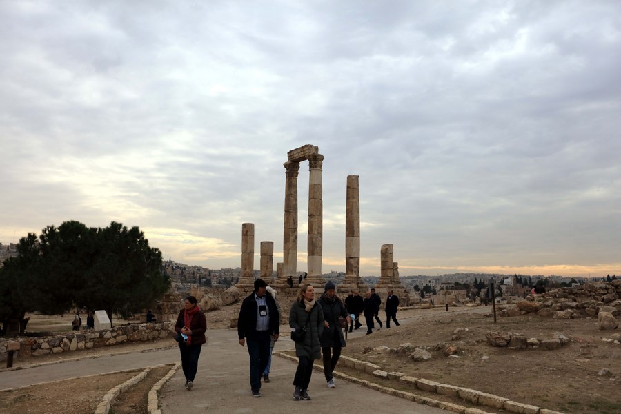 People visit the Citadel archaeological site in Amman, Jordan, on Dec. 28, 2021. (Photo by Mohammad Abu Ghosh/Xinhua)
