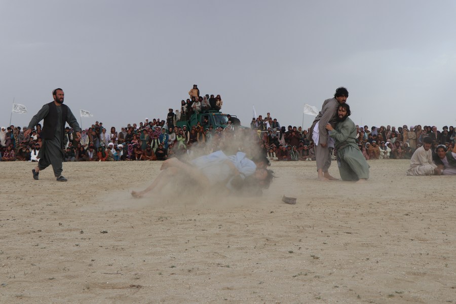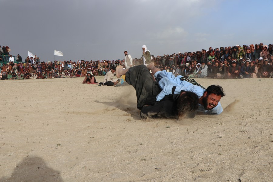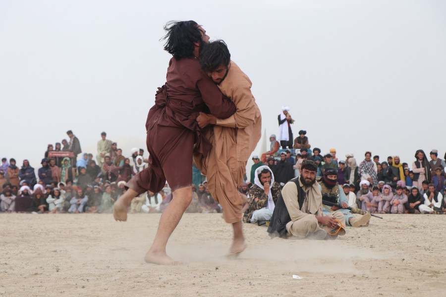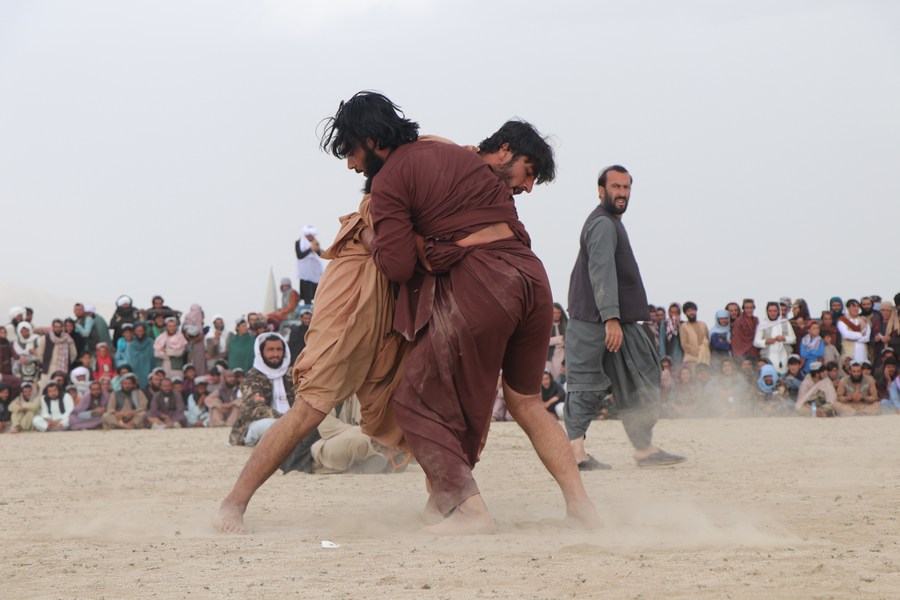 Wrestlers compete in a traditional wrestling competition in Ghazni city, Afghanistan, May 5, 2022. (Photo by Rahmat Marjankhil/Xinhua)■