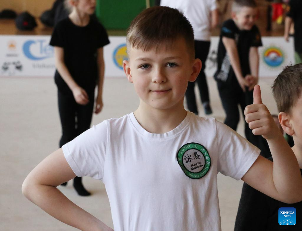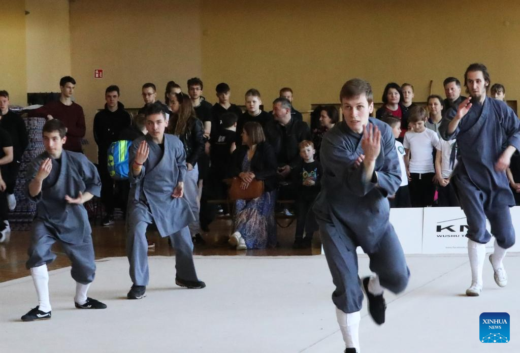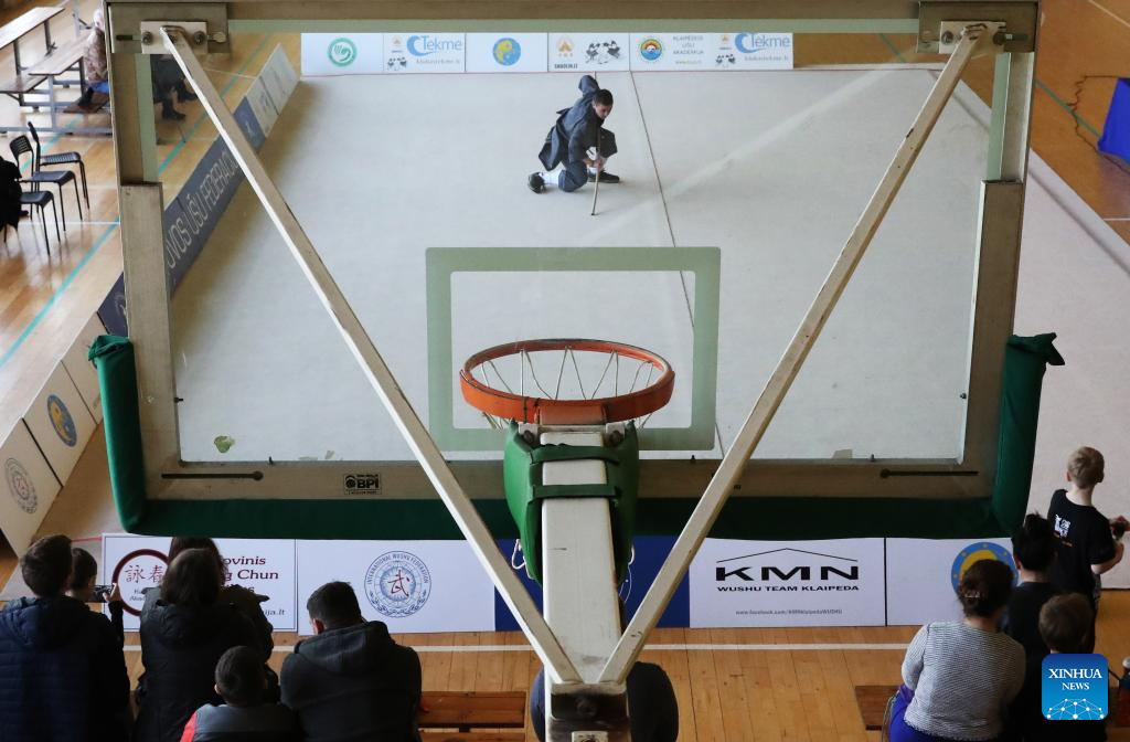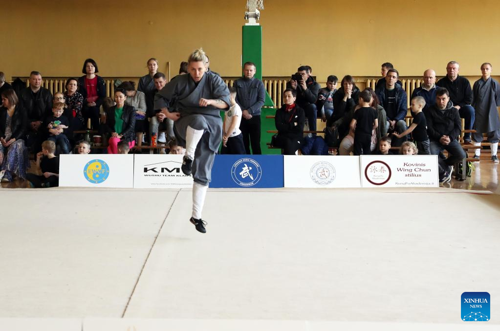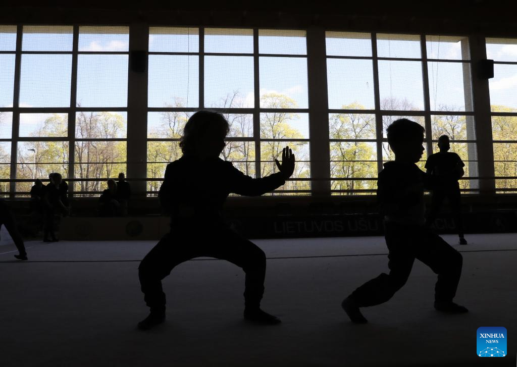 Athletes compete at the Vilnius Open Wushu Cup in Vilnius, Lithuania, on May 7, 2022. The Vilnius Open Wushu Cup opened on Saturday, drawing more than 50 students from local wushu clubs. (Xinhua/Xue Dongmei)