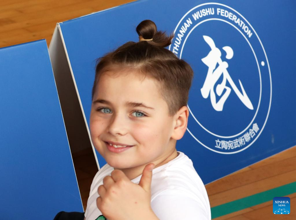 An athlete is seen at the Vilnius Open Wushu Cup in Vilnius, Lithuania, on May 7, 2022. The Vilnius Open Wushu Cup opened on Saturday, drawing more than 50 students from local wushu clubs. (Xinhua/Xue Dongmei)