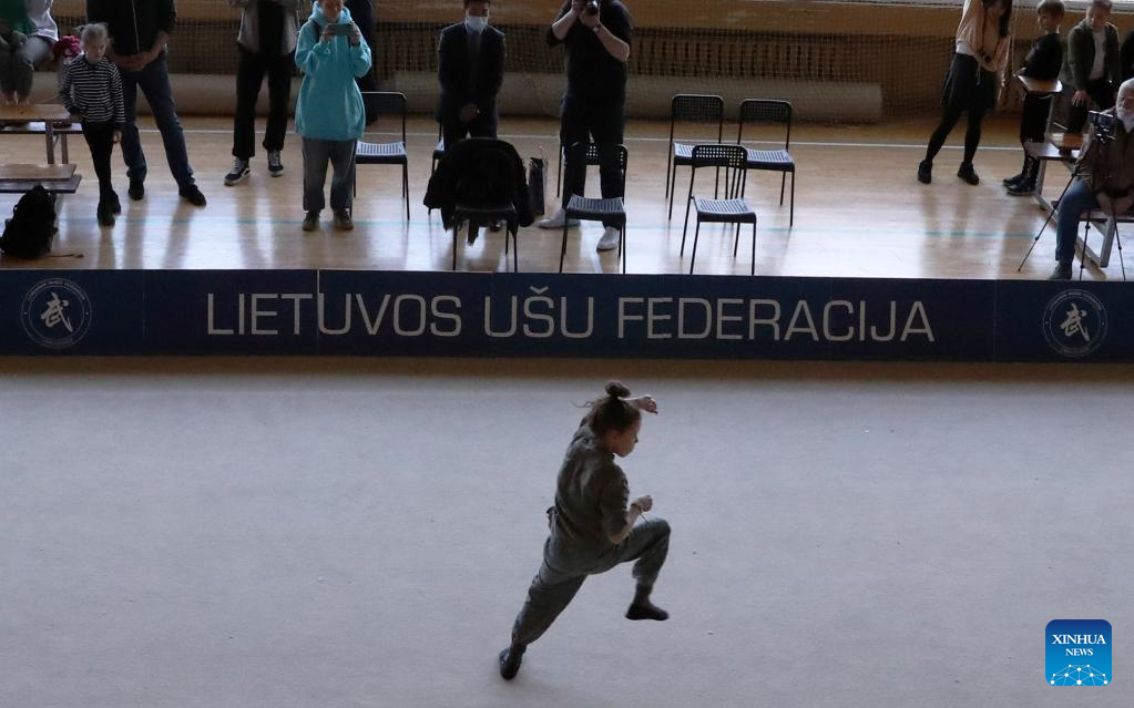 An athlete competes at the Vilnius Open Wushu Cup in Vilnius, Lithuania, on May 7, 2022. The Vilnius Open Wushu Cup opened on Saturday, drawing more than 50 students from local wushu clubs. (Xinhua/Jasmine.H)