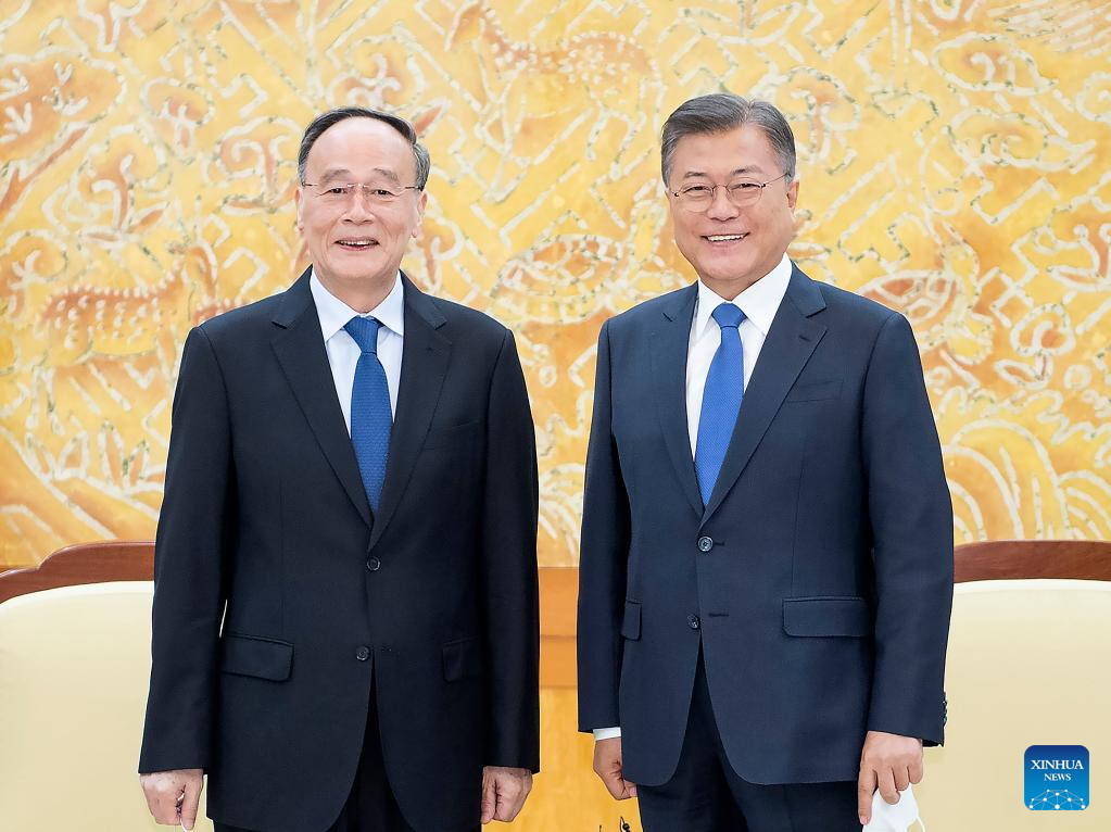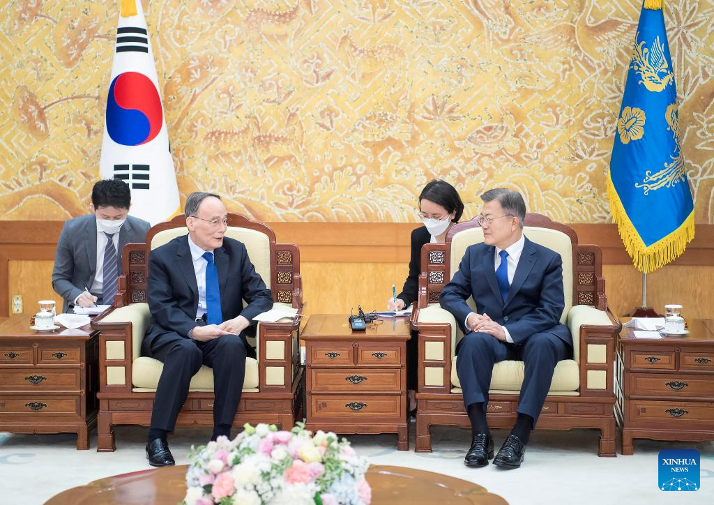 SEOUL, May 9 (Xinhua) -- Visiting Chinese Vice President Wang Qishan met with South Korea's outgoing President Moon Jae-in on Monday, saying China-South Korea relations have made significant progress over the past five years.