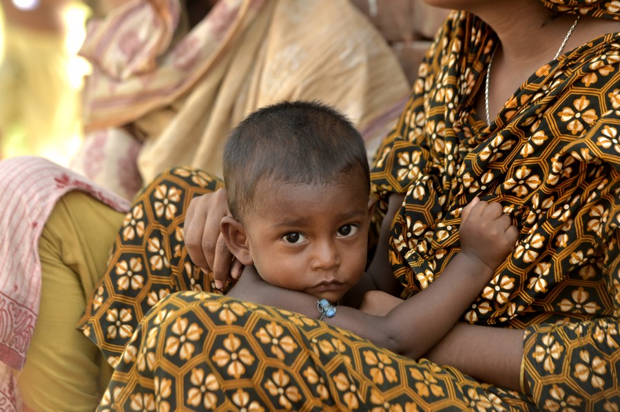 A female worker stays with a child near a brickfield in Manikganj, Bangladesh, May 8, 2022. (Xinhua)