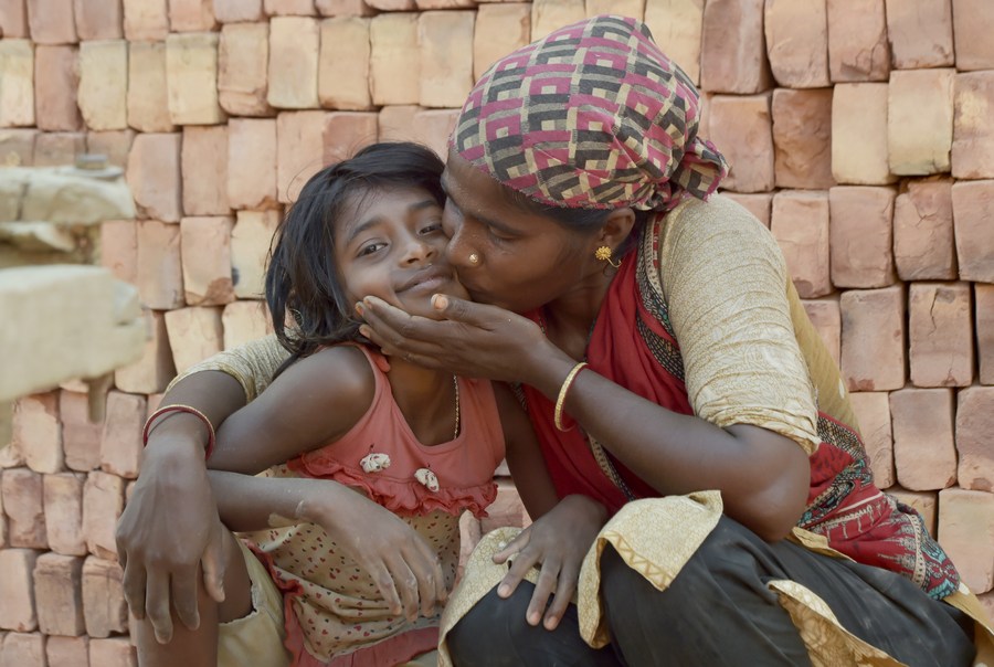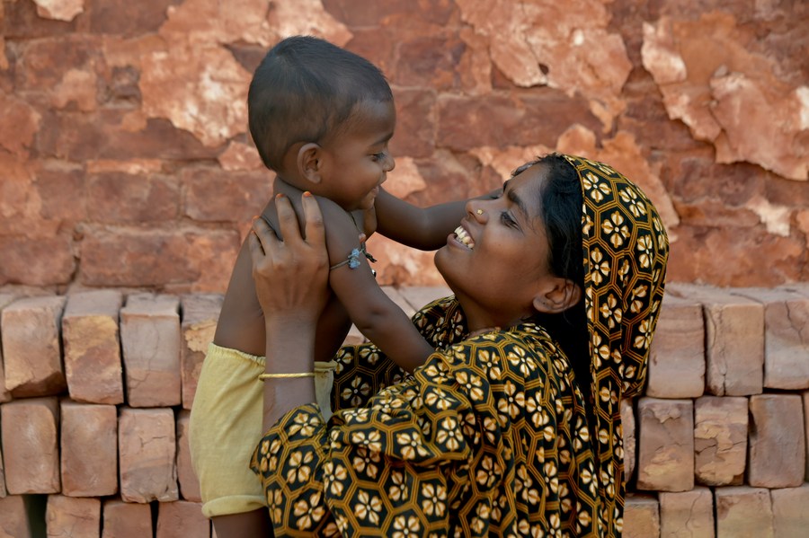 A female worker kisses a child near a brickfield in Manikganj, Bangladesh, May 8, 2022. (Xinhua)