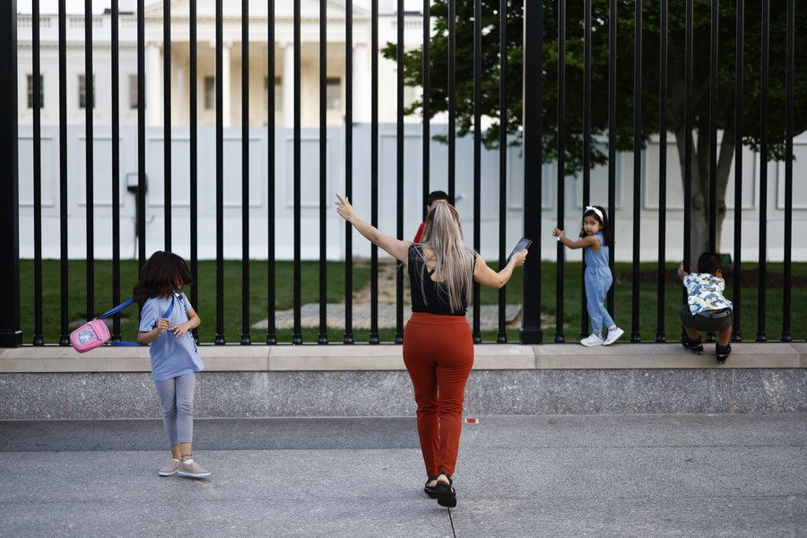Tourists and visitors spend their weekend on Pennsylvania Ave in front the White House in Washington, D.C., the United States, on April 23, 2022. (Photo by Ting Shen/Xinhua)