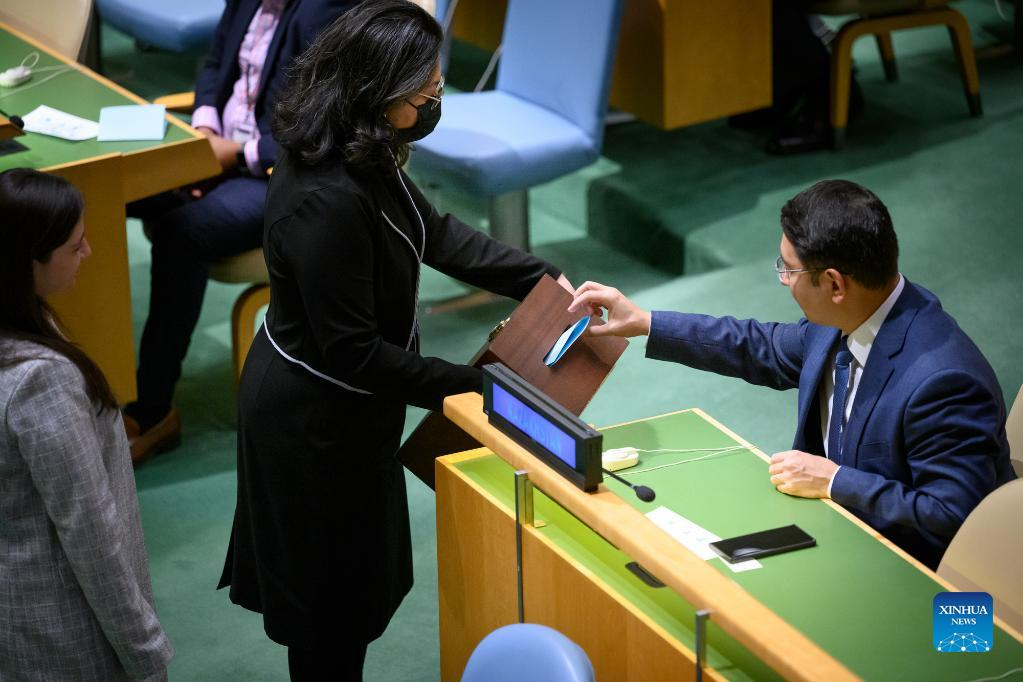 A delegate (R) casts his vote during a by-election for membership in the Human Rights Council, at the UN headquarters in New York, May 10, 2022. The UN General Assembly on Tuesday elected the Czech Republic to the Human Rights Council to fill the vacancy left by Russia, whose membership was suspended. (Loey Felipe/UN Photo/Handout via Xinhua)