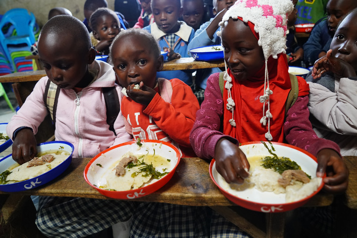Children have free school lunch in Mathare slum area, Nairobi, Kenya, April 28, 2022. (Xinhua/Dong Jianghui)