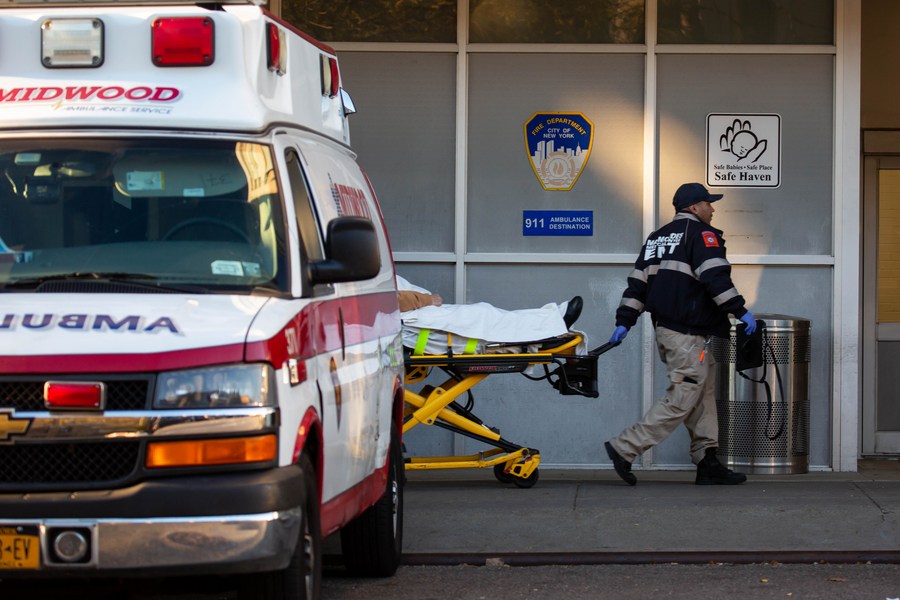 Medical workers wheel a patient into Maimonides Medical Center in the Brooklyn borough of New York, the United States, Dec. 14, 2021. (Photo by Michael Nagle/Xinhua)