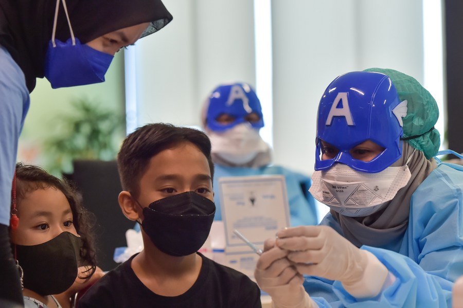 A medical worker explains the precautions for COVID-19 vaccination for a child at a vaccination site in Jakarta, Indonesia, Jan. 16, 2022. (Xinhua/Veri Sanovri)