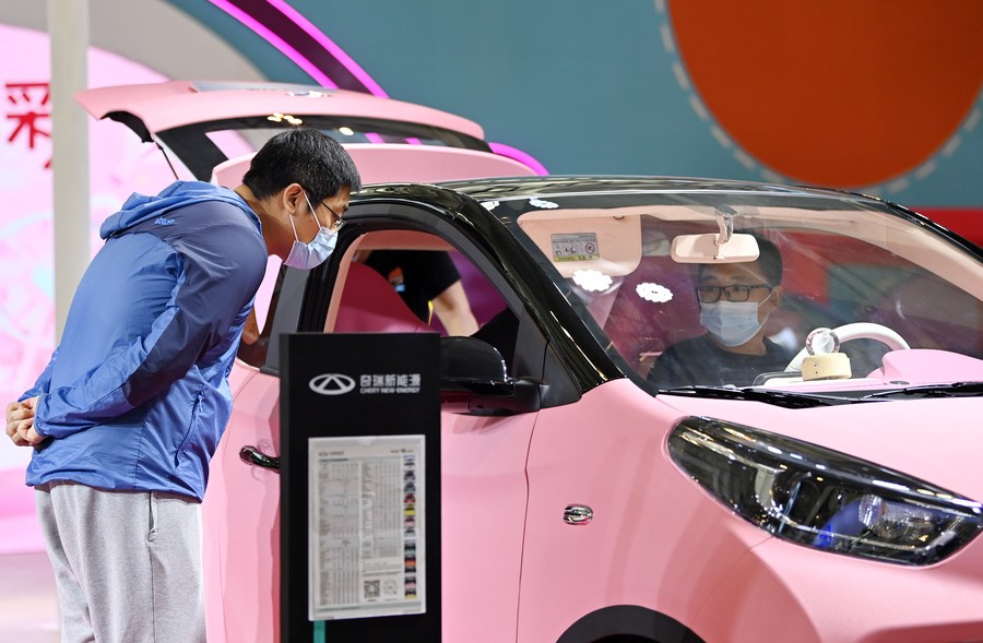 Visitors view a new energy car from Chinese automaker Chery during China (Tianjin) Auto Show 2021 in north China's Tianjin, Sept. 29, 2021. (Xinhua/Li Ran)