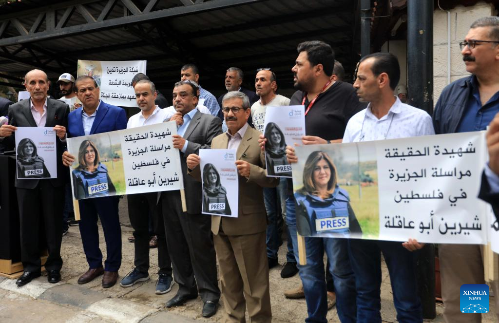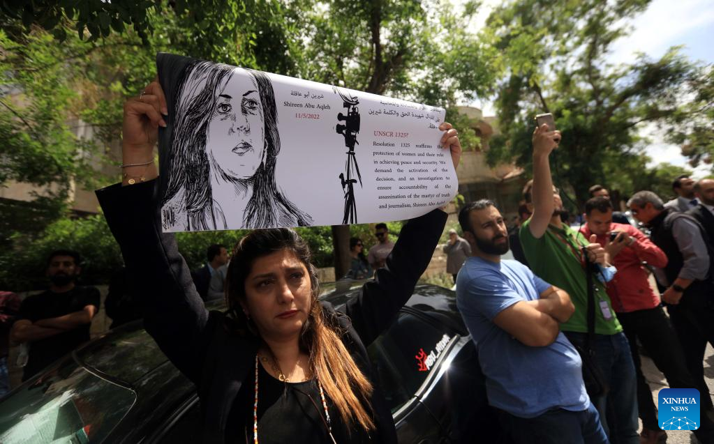 People take part in a demonstration against the killing of Al-Jazeera journalist Shireen Abu Akleh in Amman, Jordan, on May 11, 2022. Al-Jazeera journalist Shireen Abu Akleh was killed in the northern occupied West Bank on Wednesday morning. (Photo by Mohammad Abu Ghosh/Xinhua)