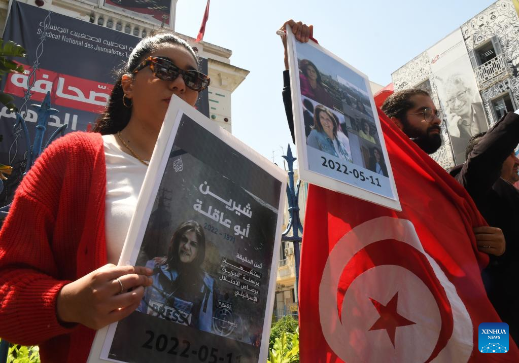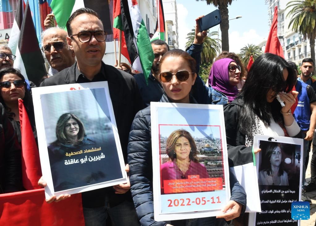 People gather to condemn the killing of Al-Jazeera journalist Shireen Abu Akleh in Tunis, Tunisia, on May 11, 2022. Al-Jazeera journalist Shireen Abu Akleh was killed in the northern occupied West Bank on Wednesday morning. (Photo by Adel Ezzine/Xinhua)